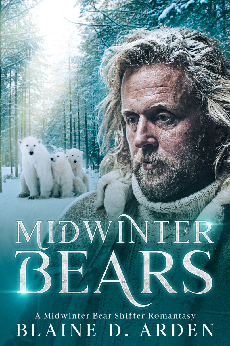 book cover description: a pensive man with long blond hair and a beard, wearing a thick knit sweater. Behind him, three polar bears stand in a snowy, pine-filled forest under a cool, bluish light.